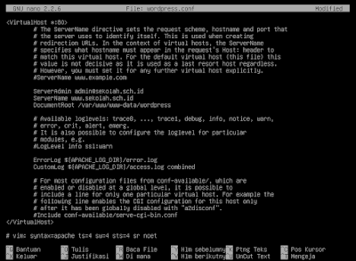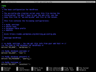 * Kemudian edit wp-config.php, seperti gambar di bawah, lalu save dengan ctrl+x,y lalu enter